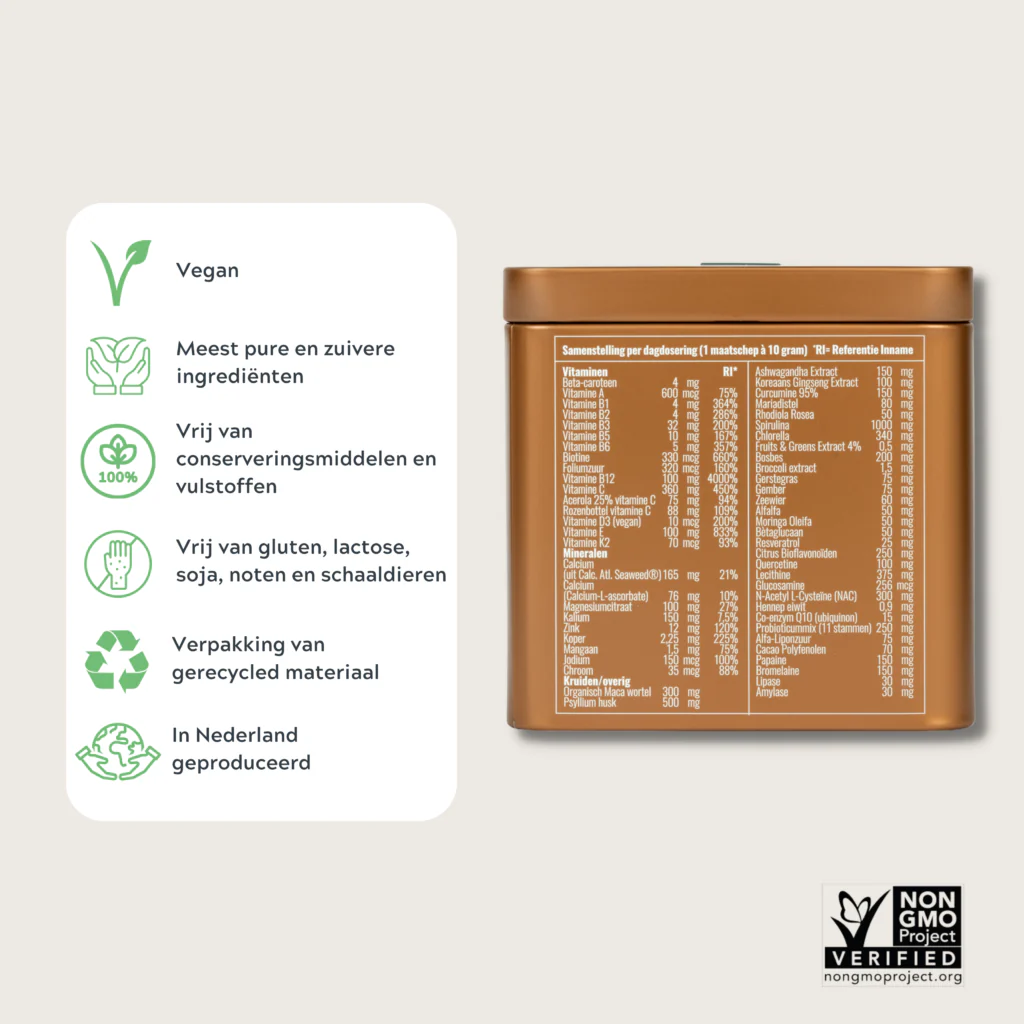 Dagelijks gebruik van groene poeder helpt het lichaam te ontzuren en afvalstoffen af te voeren. Je ervaart meer energie, een verbeterde darmfunctie en een helderdere, rustigere huid. Dankzij de combinatie van antioxidanten en ontgiftende ingrediënten is dit het beste supplement voor de huid én algehele gezondheid.