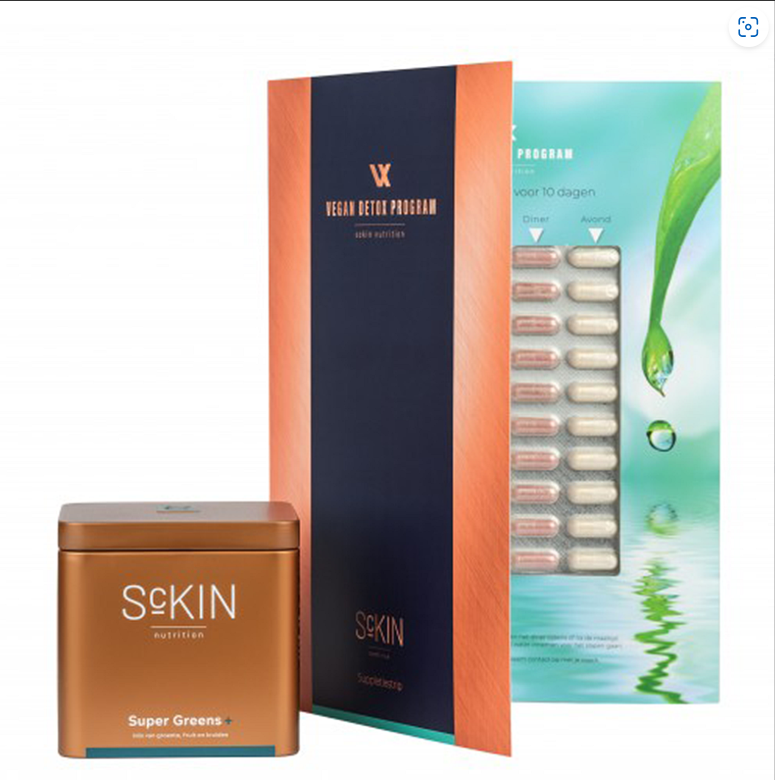 Het Sckin Vegan Detox Program bevat een 10-daagse detox kuur inclusief supplementen, begeleiding en een plant-based protocol en een pot Sckin Greens. Ideaal voor wie wil kuren, afvallen en het lichaam wil reinigen op een natuurlijke manier.