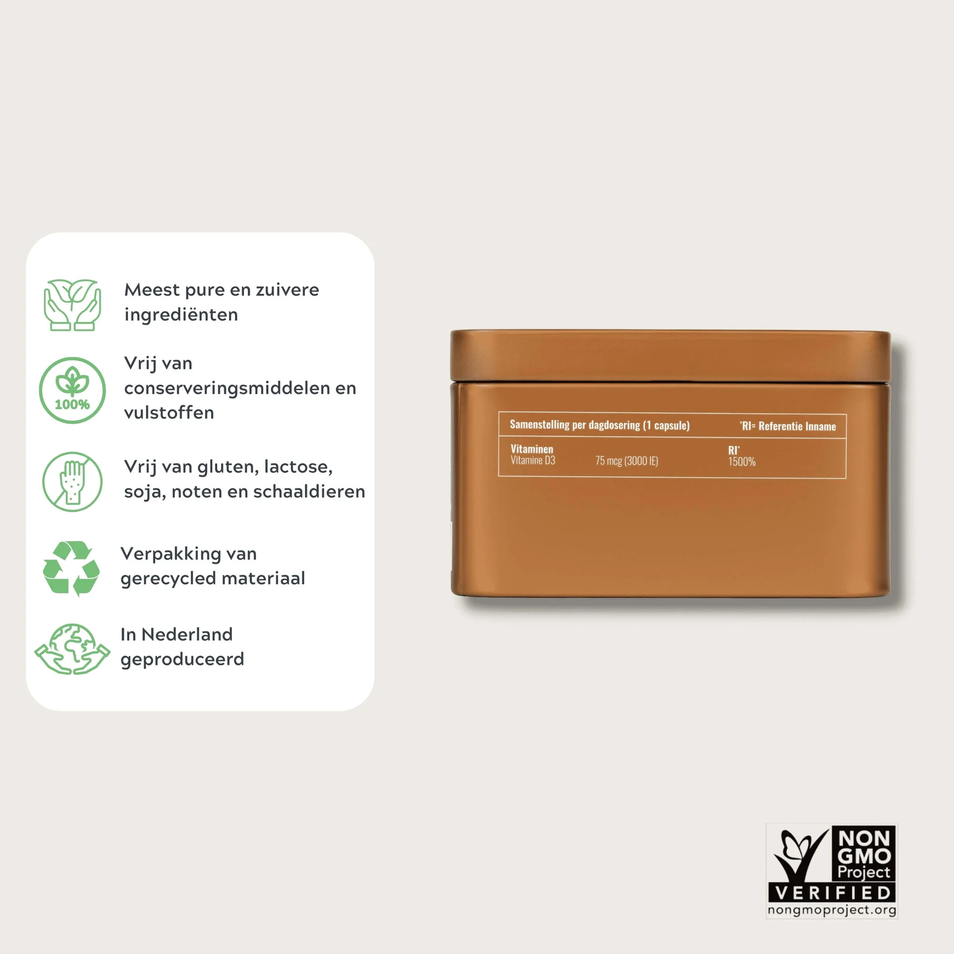 Bevat een hoge dosering vitamine D3 (cholecalciferol). Bevat 75mcg Vitamine D3 (3000 IE) uit een plantaardige bron, waardoor het geschikt is voor vegetariërs en veganisten. De opname wordt bevorderd door een natuurlijke vetbasis.